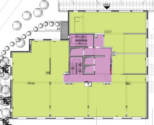 Visoko prizemlje objekta čini poslovni prostor i pristupa mu se direktno iz parka.